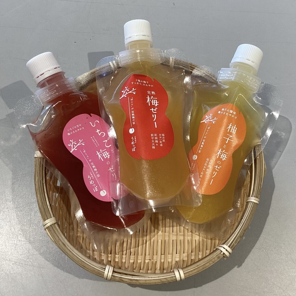 画像真ん中は他のフルーツが入っていない完熟梅ゼリー。完熟梅を使っているので酸味は控えめで甘く、酸っぱいものや梅が苦手な人でもゴクゴク飲めます!
