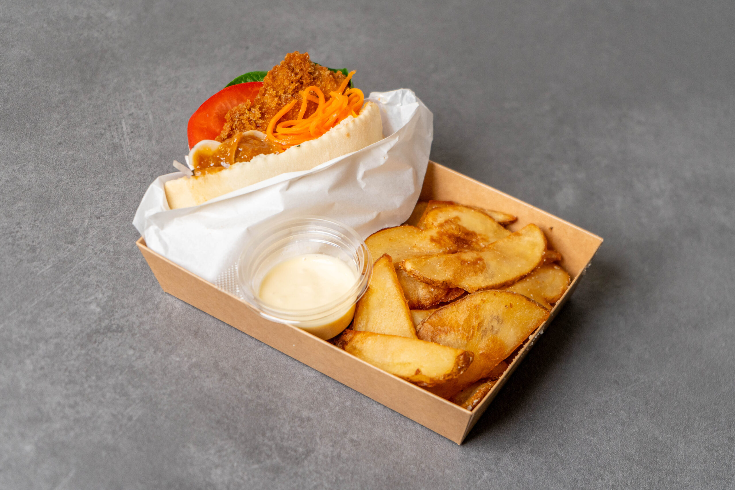 醤油香る鯖サンド ¥850~(税込)小浜の人が愛してやまない魚の醤油干し。鯖の醤油干しを竜田揚げにして、ニンジンのラぺ、揚げブロッコリー、赤玉ねぎのピクルス、トマトときゅうりのマリネ、サニーレタス、自家製ケチャップ、マヨネーズソースと一緒にパンに詰め込みました。食べる場所によってどんどん味が変わり、最初から最後まで美味しい当店の看板メニュー。自家製ポテトは、2度揚げによりカリっと仕上げています。そのまま食べても、ディップソースをつけるのもオススメ。 単品:850円 ポテトセット:1,200円